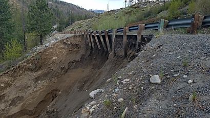 A washout occurred on SR 20, Loup Loup Pass, 10 miles west of Okanogan at milepost 222.4, just west of Rock Creek.